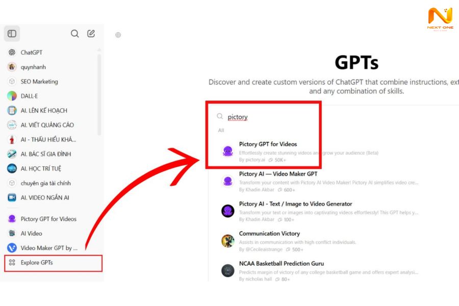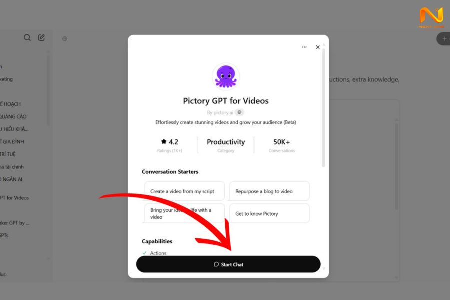 Bước 1: Trong ChatGPT, chọn Explore GPTs, tìm “Pictory” và nhấn Start chat.