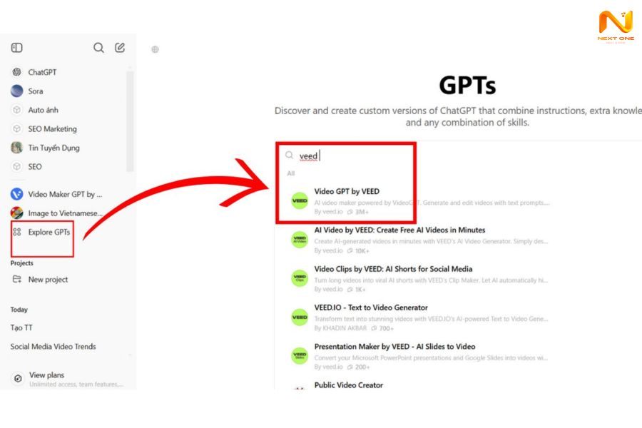 Bước 1: Trong ChatGPT, mở Explore GPTs, tìm “Video GPT by VEED” và chọn công cụ.