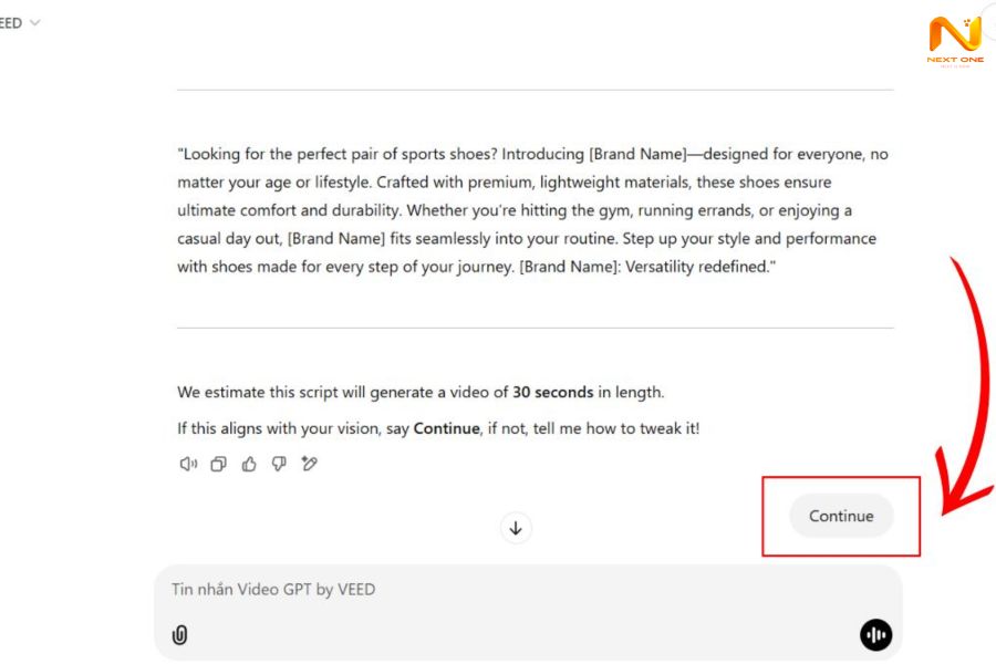 Bước 3: ChatGPT sẽ tạo kịch bản. Bạn kiểm tra, yêu cầu chỉnh sửa nếu cần, rồi nhấn Continue để AI dựng video.