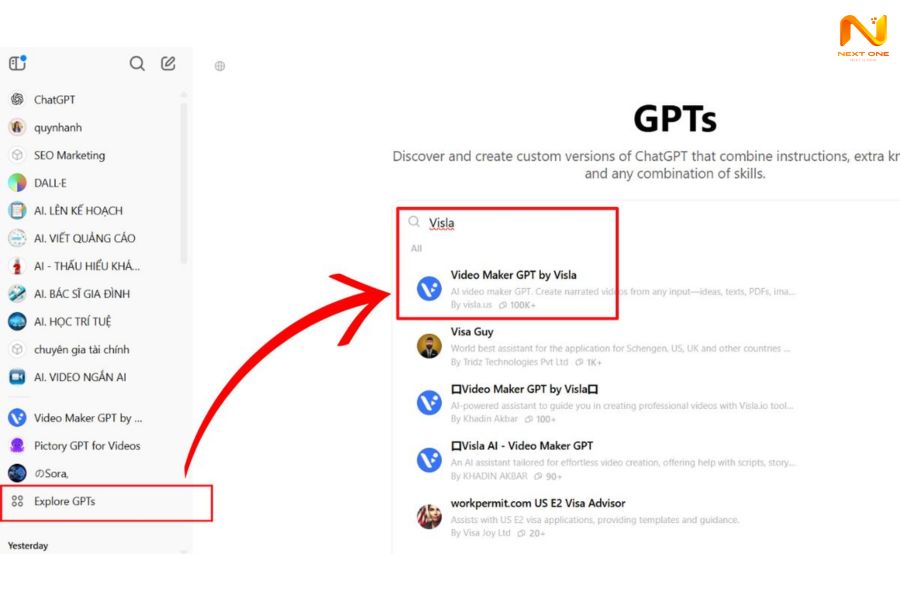 Bước 1: Trong ChatGPT, vào Explore GPTs, tìm “Visla” và chọn Start chat.