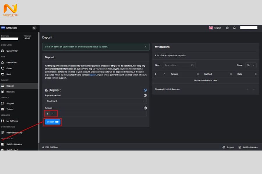 - Bước 2: Nạp tối thiểu 1 USD qua thẻ Visa/MasterCard hoặc các phương thức hỗ trợ.