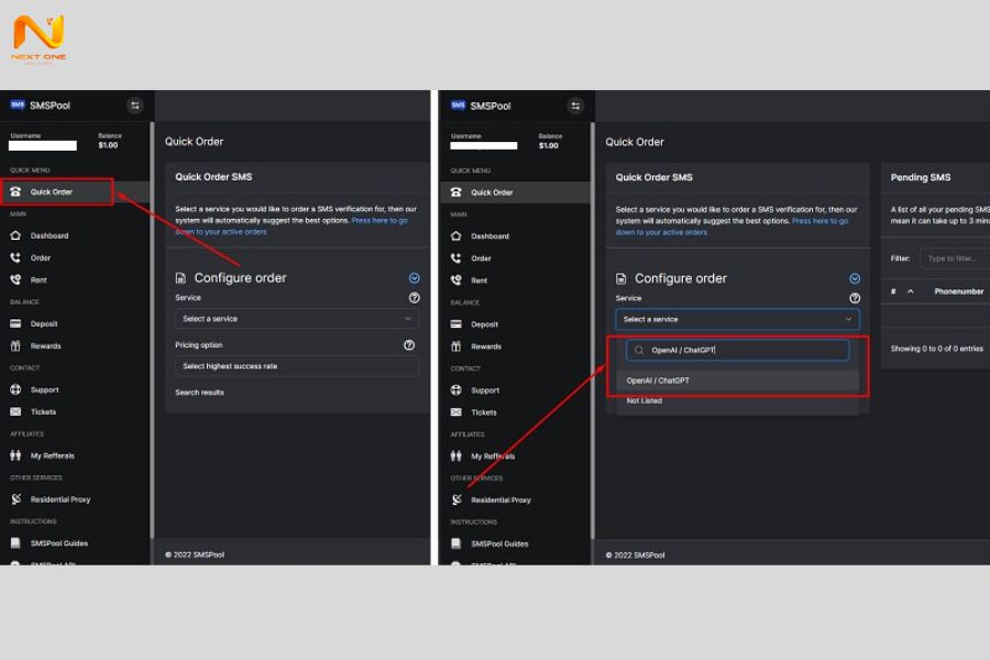 Tìm dịch vụ OpenAI/ChatGPT tại mục Quick Order trên SMSPool