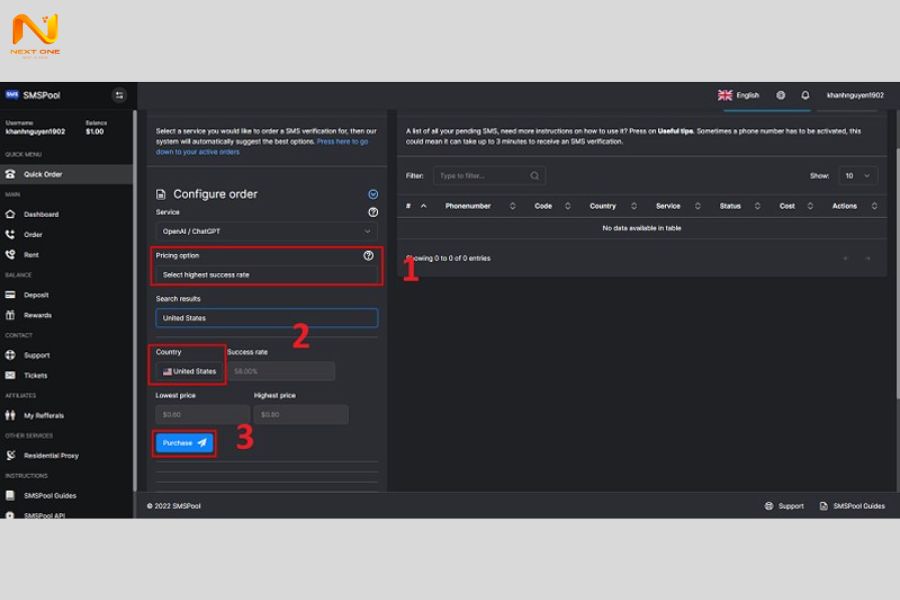 - Bước Kiểm tra kỹ quốc gia chọn trong SMSPool trùng với quốc gia trên ChatGPT.