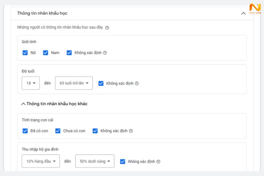 Bước 3: Chọn nhân khẩu học (tuổi, giới tính, thu nhập), sau đó tinh chỉnh bằng sở thích, hành vi, từ khóa hoặc remarketing để tập trung vào nhóm khách hàng tiềm năng nhất.